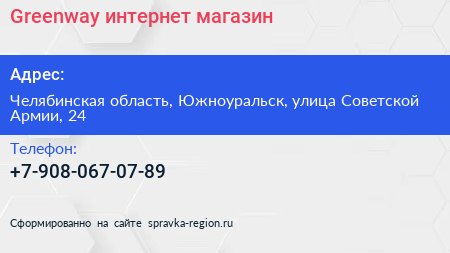 Greenway, интернет-магазин по адресу Челябинская область, Южноуральск, улица Советской Армии, 24 в дальнейшем Организация, размещена в следующих категориях: