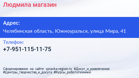 Людмила, магазин по адресу Челябинская область, Южноуральск, улица Мира, 41 в дальнейшем Организация, размещена в следующих категориях: