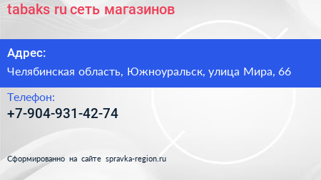 tabaks.ru, сеть магазинов по адресу Челябинская область, Южноуральск, улица Мира, 66 в дальнейшем Организация, размещена в следующих категориях: