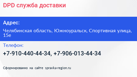 DPD, служба доставки по адресу Челябинская область, Южноуральск, Спортивная улица, 15е в дальнейшем Организация, размещена в следующих категориях: