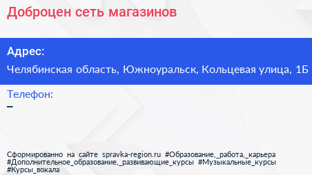 Доброцен, сеть магазинов по адресу Челябинская область, Южноуральск, Кольцевая улица, 1Б в дальнейшем Организация, размещена в следующих категориях: