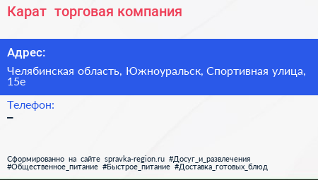 Карат+, торговая компания по адресу Челябинская область, Южноуральск, Спортивная улица, 15е в дальнейшем Организация, размещена в следующих категориях: