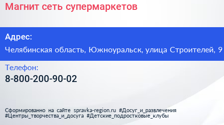 Магнит, сеть супермаркетов по адресу Челябинская область, Южноуральск, улица Строителей, 9 в дальнейшем Организация, размещена в следующих категориях: