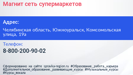 Магнит, сеть супермаркетов по адресу Челябинская область, Южноуральск, Комсомольская улица, 19а в дальнейшем Организация, размещена в следующих категориях: