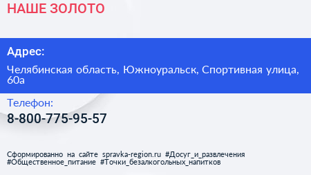 НАШЕ ЗОЛОТО по адресу Челябинская область, Южноуральск, Спортивная улица, 60а в дальнейшем Организация, размещена в следующих категориях: