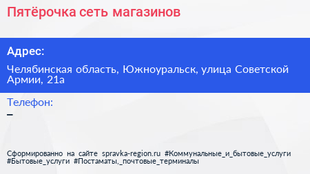 Пятёрочка, сеть магазинов по адресу Челябинская область, Южноуральск, улица Советской Армии, 21а в дальнейшем Организация, размещена в следующих категориях: