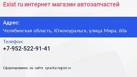 Exist.ru, интернет-магазин автозапчастей по адресу Челябинская область, Южноуральск, улица Мира, 60а в дальнейшем Организация, размещена в следующих категориях: