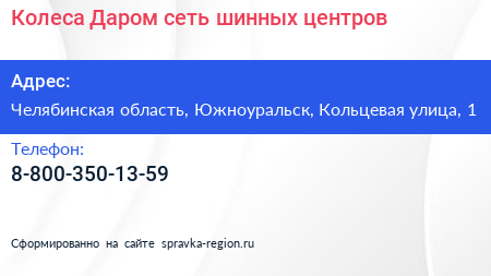 Колеса Даром, сеть шинных центров по адресу Челябинская область, Южноуральск, Кольцевая улица, 1 в дальнейшем Организация, размещена в следующих категориях:
