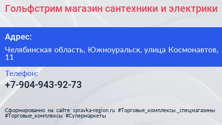 Гольфстрим, магазин сантехники и электрики по адресу Челябинская область, Южноуральск, улица Космонавтов, 11 в дальнейшем Организация, размещена в следующих категориях: