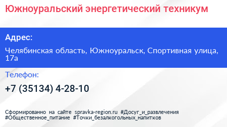 Южноуральский энергетический техникум по адресу Челябинская область, Южноуральск, Спортивная улица, 17а в дальнейшем Организация, размещена в следующих категориях:
