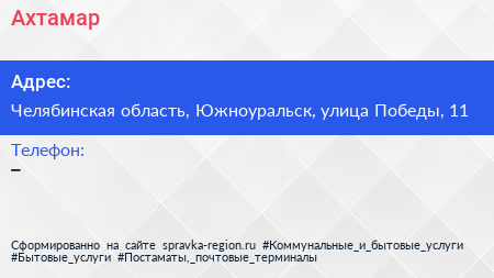 Ахтамар по адресу Челябинская область, Южноуральск, улица Победы, 11 в дальнейшем Организация, размещена в следующих категориях: