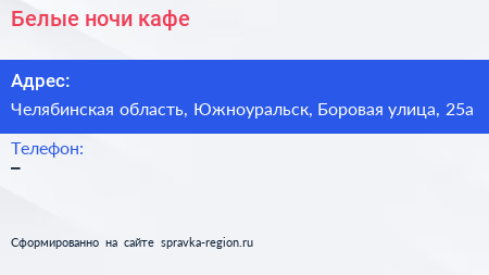Белые ночи, кафе по адресу Челябинская область, Южноуральск, Боровая улица, 25а в дальнейшем Организация, размещена в следующих категориях: