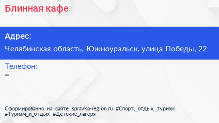 Блинная, кафе по адресу Челябинская область, Южноуральск, улица Победы, 22 в дальнейшем Организация, размещена в следующих категориях: