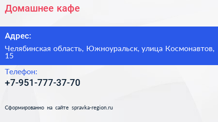 Домашнее, кафе по адресу Челябинская область, Южноуральск, улица Космонавтов, 15 в дальнейшем Организация, размещена в следующих категориях:
