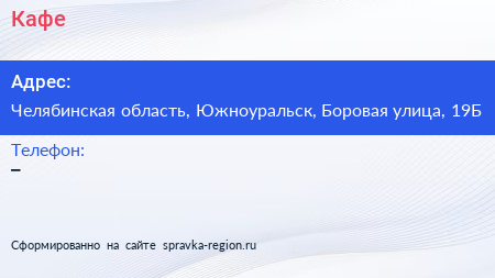 Кафе по адресу Челябинская область, Южноуральск, Боровая улица, 19Б в дальнейшем Организация, размещена в следующих категориях: