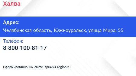 Халва по адресу Челябинская область, Южноуральск, улица Мира, 55 в дальнейшем Организация, размещена в следующих категориях: