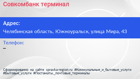 Совкомбанк, терминал по адресу Челябинская область, Южноуральск, улица Мира, 43 в дальнейшем Организация, размещена в следующих категориях:
