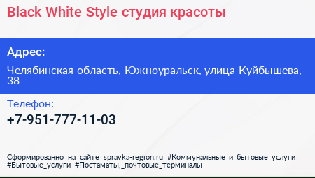 Black White Style, студия красоты по адресу Челябинская область, Южноуральск, улица Куйбышева, 38 в дальнейшем Организация, размещена в следующих категориях: