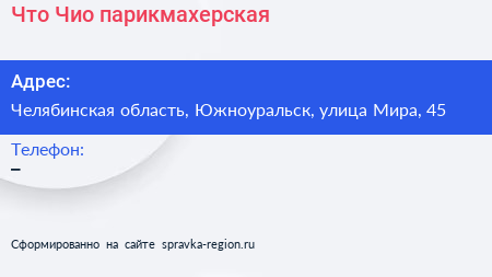 Что Чио, парикмахерская по адресу Челябинская область, Южноуральск, улица Мира, 45 в дальнейшем Организация, размещена в следующих категориях: