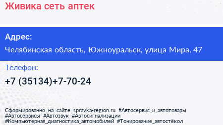 Живика, сеть аптек по адресу Челябинская область, Южноуральск, улица Мира, 47 в дальнейшем Организация, размещена в следующих категориях: