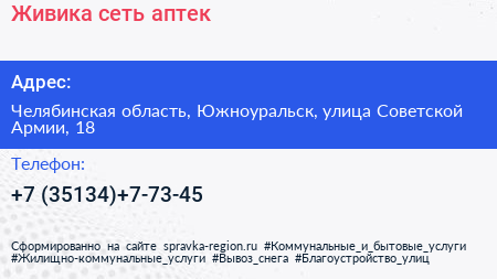 Живика, сеть аптек по адресу Челябинская область, Южноуральск, улица Советской Армии, 18 в дальнейшем Организация, размещена в следующих категориях: