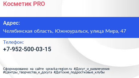 Косметик`PRO по адресу Челябинская область, Южноуральск, улица Мира, 47 в дальнейшем Организация, размещена в следующих категориях: