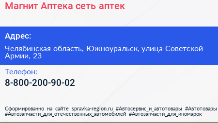 Магнит Аптека, сеть аптек по адресу Челябинская область, Южноуральск, улица Советской Армии, 23 в дальнейшем Организация, размещена в следующих категориях: