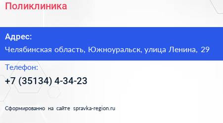 Поликлиника по адресу Челябинская область, Южноуральск, улица Ленина, 29 в дальнейшем Организация, размещена в следующих категориях: