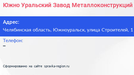 Южно-Уральский Завод Металлоконструкций по адресу Челябинская область, Южноуральск, улица Строителей, 1 в дальнейшем Организация, размещена в следующих категориях: