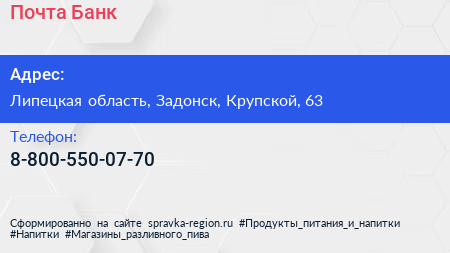 Почта Банк по адресу Липецкая область, Задонск, Крупской, 63 в дальнейшем Организация, размещена в следующих категориях:
