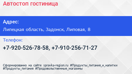 Автостоп, гостиница по адресу Липецкая область, Задонск, Липовая, 8 в дальнейшем Организация, размещена в следующих категориях: