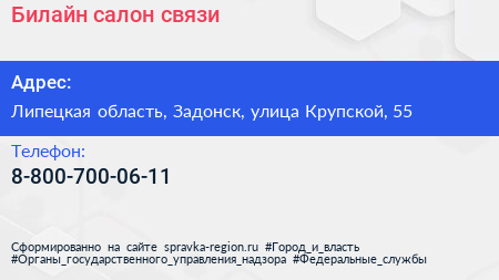Билайн, салон связи по адресу Липецкая область, Задонск, улица Крупской, 55 в дальнейшем Организация, размещена в следующих категориях: