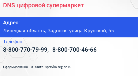 DNS, цифровой супермаркет по адресу Липецкая область, Задонск, улица Крупской, 55 в дальнейшем Организация, размещена в следующих категориях: