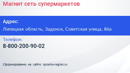 Магнит, сеть супермаркетов по адресу Липецкая область, Задонск, Советская улица, 86а в дальнейшем Организация, размещена в следующих категориях: