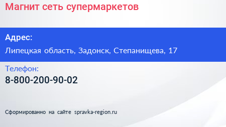 Магнит, сеть супермаркетов по адресу Липецкая область, Задонск, Степанищева, 17 в дальнейшем Организация, размещена в следующих категориях: