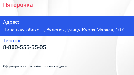 Пятерочка по адресу Липецкая область, Задонск, улица Карла Маркса, 107 в дальнейшем Организация, размещена в следующих категориях: