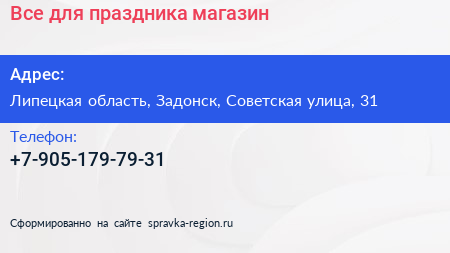 Все для праздника, магазин по адресу Липецкая область, Задонск, Советская улица, 31 в дальнейшем Организация, размещена в следующих категориях:
