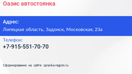Оазис, автостоянка по адресу Липецкая область, Задонск, Московская, 23а в дальнейшем Организация, размещена в следующих категориях: