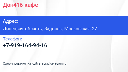 Дон416, кафе по адресу Липецкая область, Задонск, Московская, 27 в дальнейшем Организация, размещена в следующих категориях:
