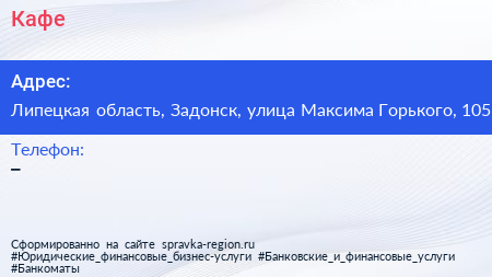 Кафе по адресу Липецкая область, Задонск, улица Максима Горького, 105 в дальнейшем Организация, размещена в следующих категориях: