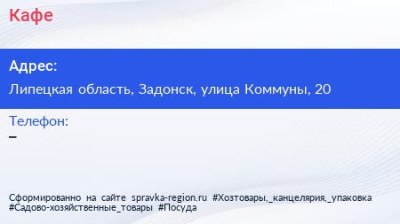 Кафе по адресу Липецкая область, Задонск, улица Коммуны, 20 в дальнейшем Организация, размещена в следующих категориях: