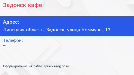 Задонск, кафе по адресу Липецкая область, Задонск, улица Коммуны, 13 в дальнейшем Организация, размещена в следующих категориях: