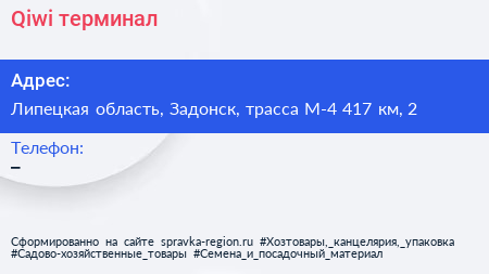 Qiwi, терминал по адресу Липецкая область, Задонск, трасса М-4 417 км, 2 в дальнейшем Организация, размещена в следующих категориях: