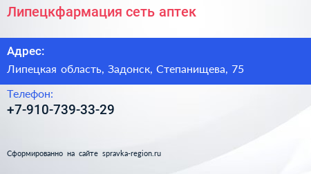 Липецкфармация, сеть аптек по адресу Липецкая область, Задонск, Степанищева, 75 в дальнейшем Организация, размещена в следующих категориях: