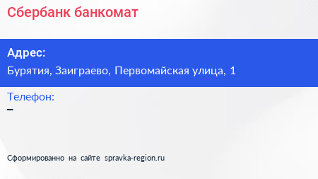 Сбербанк, банкомат по адресу Бурятия, Заиграево, Первомайская улица, 1 в дальнейшем Организация, размещена в следующих категориях: