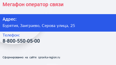 Мегафон, оператор связи по адресу Бурятия, Заиграево, Серова улица, 25 в дальнейшем Организация, размещена в следующих категориях: