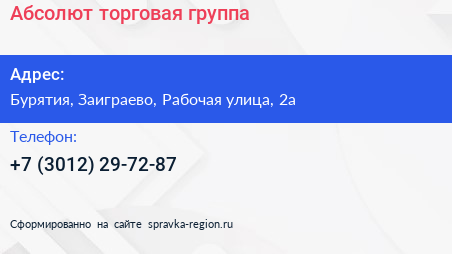 Абсолют, торговая группа по адресу Бурятия, Заиграево, Рабочая улица, 2а в дальнейшем Организация, размещена в следующих категориях: