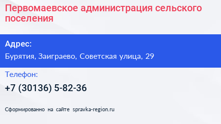Первомаевское, администрация сельского поселения по адресу Бурятия, Заиграево, Советская улица, 29 в дальнейшем Организация, размещена в следующих категориях:
