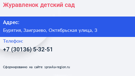 Журавленок, детский сад по адресу Бурятия, Заиграево, Октябрьская улица, 3 в дальнейшем Организация, размещена в следующих категориях: