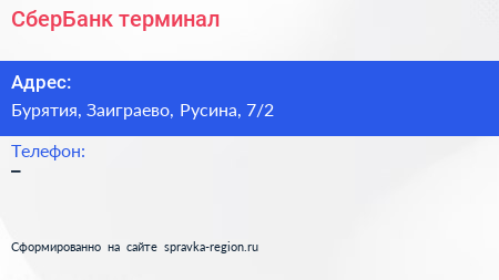 СберБанк, терминал по адресу Бурятия, Заиграево, Русина, 7/2 в дальнейшем Организация, размещена в следующих категориях: